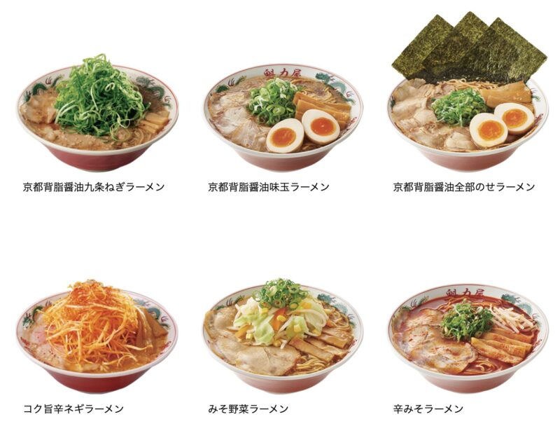 - 京都背脂醤油全部のせラーメン:チャーシュー2倍・味付玉子・のりを全トッピングした贅沢仕様。並で1,100円(税込)など。