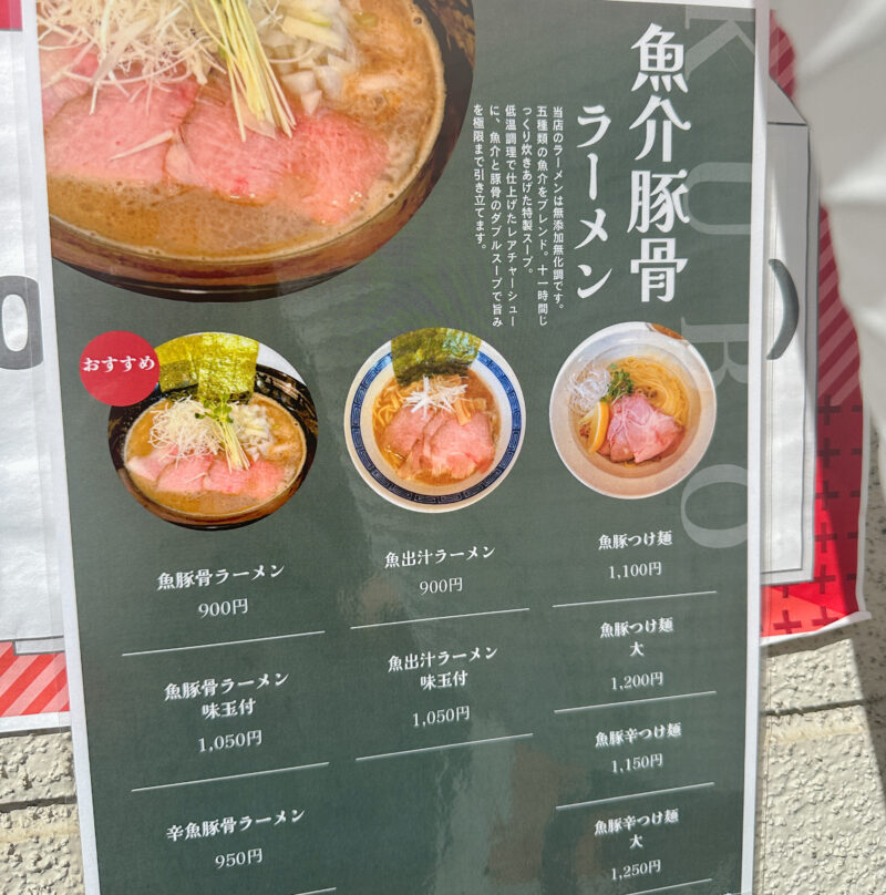 店頭メニューを見ると、看板の「魚豚骨ラーメン(900円)」をはじめ、魚出汁ラーメン、つけ麺、辛魚豚骨ラーメンなどバリエーション豊富。