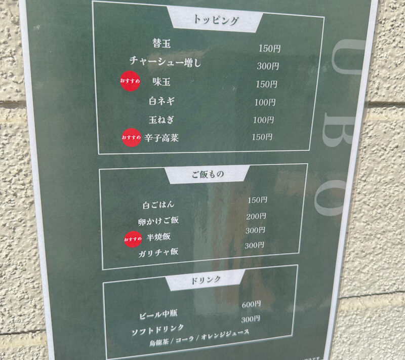 - トッピング(味玉150円/チャーシュー増し300円 など)