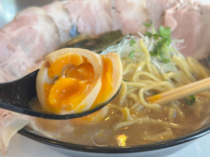 味玉は黄身がとろりと半熟。スープに絡ませて食べると、コクとまろやかさがさらにアップ。