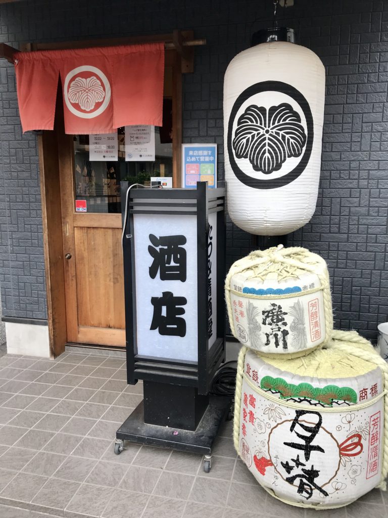 看板の「うまい酒しか置かない酒屋」がキャッチーで印象的です。
